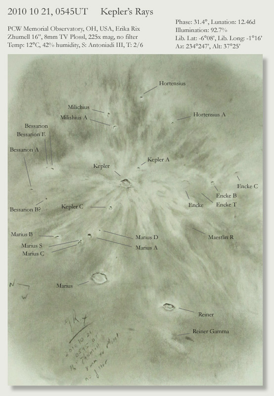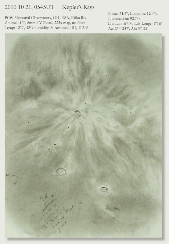 Sketching rays was not an easy task for me. I found it much more enjoyable to sketch all the craters in the area. My tips to anyone wishing to use white paper instead of black: draw in your craters first so that you have anchors for ray placements, concentrate solely on the dark areas, work in layers – light to dark, work in wedges around the origin crater, and finally…patience is the key. The craters are the easiest part of the sketch!