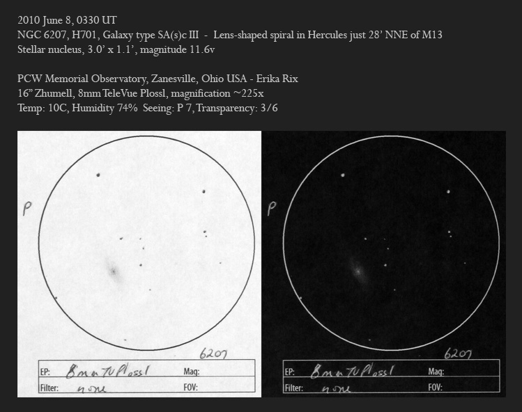 The tapered ends were allusive…in fact, they were diffuse and seemed to dissolve as they extended outward. For a closer look, please check out the link NGC 6207 from The NGC/IC Project by Robert E. Erdmann, Jr.