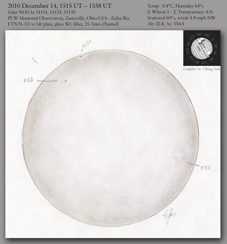 I warmed up my disfigured eyepiece cup with my hand so that I could manipulate it back to its original form after packing it away quickly from my last session. The view was like a saw blade, but I had a few moments of steady “enough” skies to make out both the umbrae and penumbrae of the sunspots in 1131 and 1133, as well as the facula around 1131, with a hint of facula around 1133. AR1135 was only visible to me by its facula. AR1134 was elusive and I saw no hints of that active region. AR1131 was appeared flattened as we often see when the sunspots are so close to the limb.