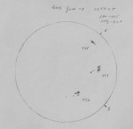 We enjoyed white light views with the “mighty” ETX-70. I even have the sketch from that day. John may not know it, but he gave me a bit of advice regarding solar sketching. He told me that there’s a tendency for sketchers to oversize sunspots. And he’s right! Without realizing it, it’s a very easy thing to do and a good chance I’ve done it in the sketch below. By keeping that in mind, I try to be very careful about depicting accurate sizes on the features. Now if anything, I sometimes tend to overcompensate and make the active regions a little smaller than they really are.