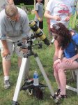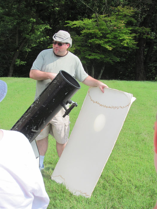 After the initial presentation, there were three telescopes set up for viewing: one for projection with an 8″ reflector, a Solarmax 60mm, and then a homemade 6-8″ solar “reflector” without a mirror reflective coating that was made for solar observing. A demonstration was given on the dangers of solar observing without proper equipment by holding a piece of bark behind the eyepiece and how quickly it scorched and started smoking.
