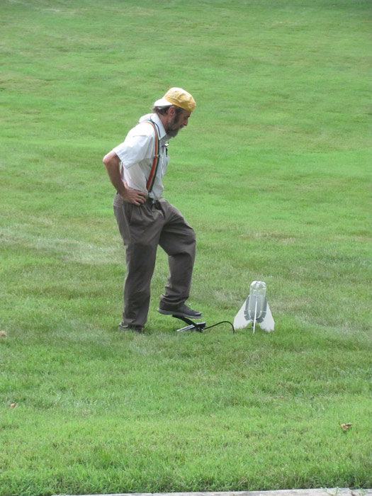 Two were set off. One used the electric from his car battery as an igniter. This one (shown in the photo) was made from a plastic soda bottle, water, and air. The pressure of the air combined with the compressible water was used to launch the rocket. (Hint: we were told that when he was ten years old and experimented, he found that jello worked better than water!)