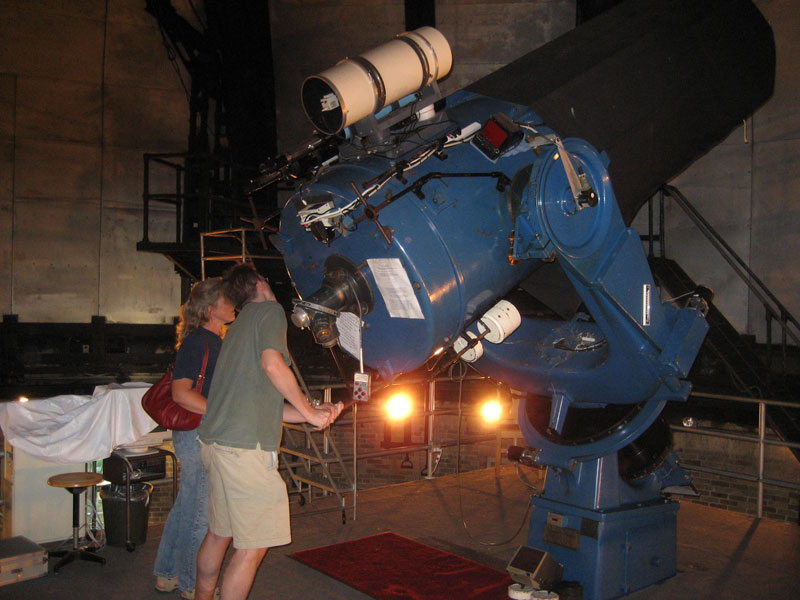 It’s always a little exciting driving up to an observatory. I love walking up the steps and through those big doors. To the right is the library stuffed with books, computers, telescopes and other astronomy paraphernalia. What I would give to have a library like that in my own home. To the left is a wood-floored room filled with chairs and a little stage. Walking through the entrance way, you can go up the steps to the observatory or down the steps to other rooms filled with learning aids and the ATM room where the likes of mirrors can be grinded for your own scopes.