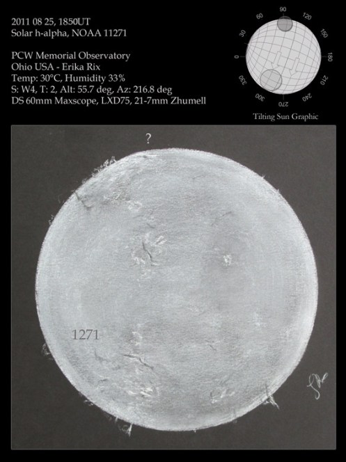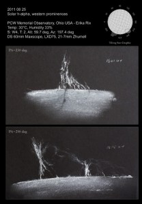 There were clear skies while setting up, then changed to overcast skies immediately following. I finally got about an hour’s worth of observing in between the scattered clouds later in the day. Even scattered clouds can make sketching prominences difficult because prominences change so quickly that every minute counts. If I’m forced to stop sketching for a few minutes because of cloud cover, often the sketch will need go unfinished because the sketch is too different to the current view when the clouds move away. The differences may be small, but they are certainly there.