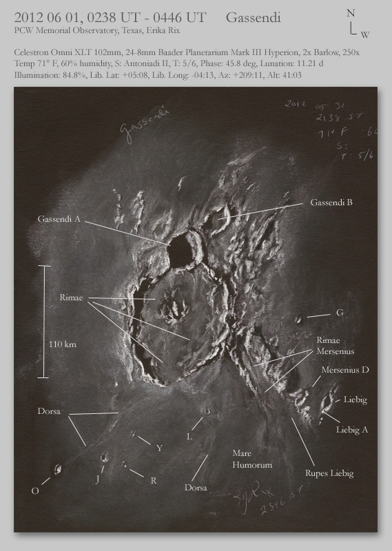 Crater Gassendi A was formed during the Copernician period (–1.1 billion years ago to the present day) and overlaps Gassendi’s northern rim. The pairing of Gassendi and Gassendi A resembles a diamond ring and makes a very striking feature to observe 3 days after first quarter or two days after last quarter of lunation. My observation was nearly three days after first quarter.
