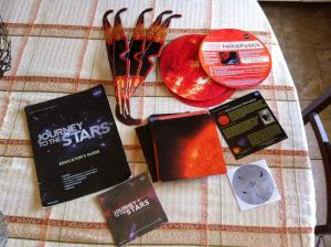 I brought my 16″ Zhumell reflector f/4.5 and DS Maxscope 60mm h-alpha rig. NASA Night Sky Network had just sent me a package full of goodies to hand out that introduces the Solar Dynamics Observatory and also more Sun “pizzas” that introduces heliophysics. So those along with the solar safe viewing glasses from the Charlie Bates Solar Astronomy Outreach Club that I’m associated with, there was plenty of handouts for people to take home to perk their interest in the Sun.