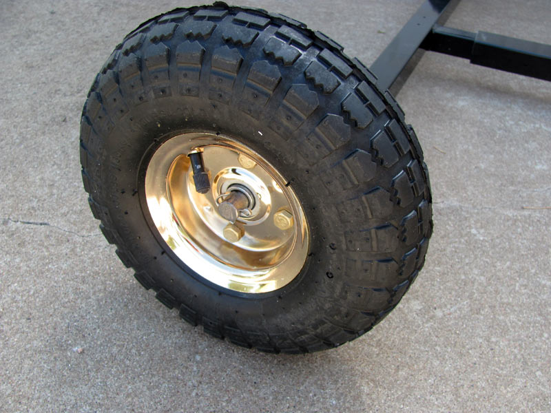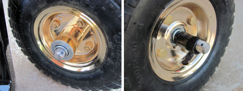 The front wheel is easily put in place with the bushing and axle. One side of the wheel requires a bushing and the other side has a bearing hub already in place. The wheels are made of gold anodized steel.