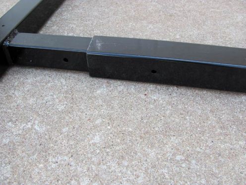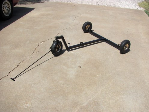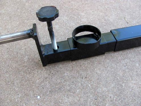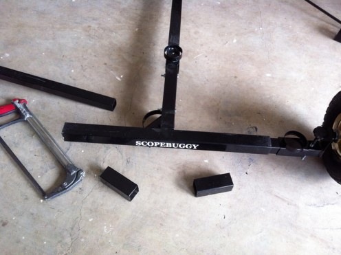 When the new footpads arrived, the square bases of them were the same size as the original ones, only the round footpad sections of them were larger. I called Larry again and reiterated the measurements. Larry was very apologetic stating that he misunderstood the first time, although I’m certain the fault was likely mine for not explaining the problem very well. He told me the best thing to do was to cut the excess length off of both sides of the rear section of the t-bar with a hacksaw, being very careful to get the measurements correct. He set my mind to ease stating that to do so would not weaken the integrity of the buggy. For anyone wondering how the rear axles remain in place without the use of bolts to secure them to the t-bar (as the gooseneck is held in place), the weight of the tripod/mount is responsible for locking the axles in place. I have to admit I was a bit dubious until I used the ScopeBuggy several times and discovered they did indeed remain in place and didn’t slide outward, even with turning the buggy around corners.