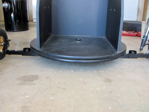 How easily does everything pack up to take to another observing site? I simply remove the two rear axles (remember, no pins or bolts hold them onto the t-bar) and lay them on top of the gooseneck/t-bar section to the side of my mount. They take up very little space even with those 10” tires. I have a CRV and packed up my 16” reflector with its Dobsonian mount, my LXD 75, a refractor, and my other accessories and still had room to spare. You can barely spot one of the wheels of the buggy off to the right under the white step stool.