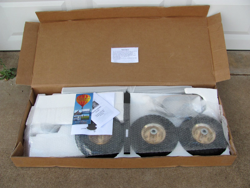 There is no list of parts for the ScopeBuggy, but a quick scan through the assembly instructions confirmed that nothing was missing. Clockwise starting at lower left corner: front steering yoke, hardware, three 3/8” bolts to keep the buggy from moving, three foot pads (the smaller ones are shown in this photo), three 10″ pneumatic wheels, gooseneck bar, t-bar, two rear axles, push/pull handle. The tape measure is mine and did not come with the buggy.