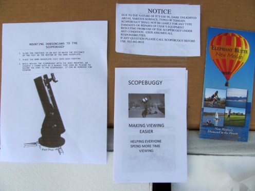 Included were instructions on how to assemble the ScopeBuggy, contact info, tourist information on Elephant Butte, NM and information on how to mount Dobsonians to the ScopeBuggy.