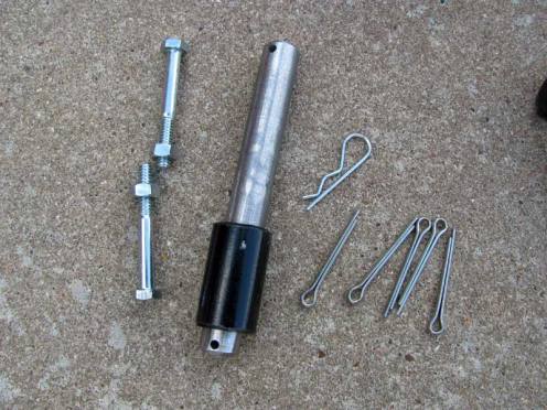 Tools that I needed for assembly were two wrenches for the bolts and a pair of pliers for the cotter pins. Hardware included: five cotter pins, one clip pin, wheel bushing and front wheel axle, two bolts and nuts used to hold the gooseneck in place on the t-bar.