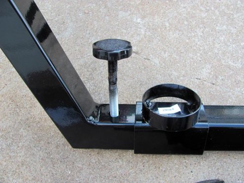The gooseneck is held firmly to the t-bar with two bolts/nuts in the pre-drilled holes of the center bar. There are three holes to allow length adjustment of the gooseneck from 32” to a reach of 38”. If more length is needed, you can contact ScopeBuggy and request an extension bar.