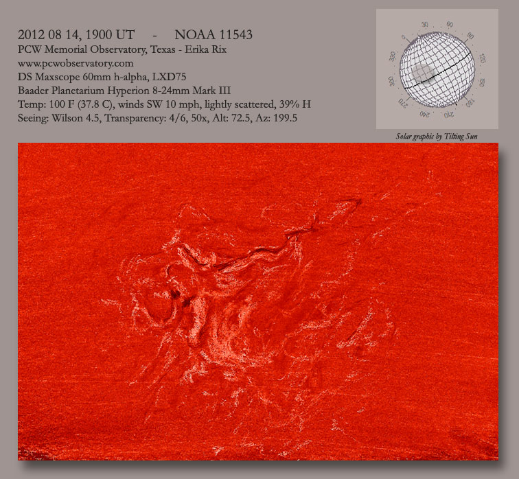 AR 1542 had plage and a filament, but I didn’t see sunspots in that region. With the heat at 100F and winds, I have to admit I didn’t stray for long from AR 1543 so may have missed any great detail in 1542. There were several bright prominences on the western limb and fainter ones scattered about the entire disk as well as more plage to the eastern hemisphere.
