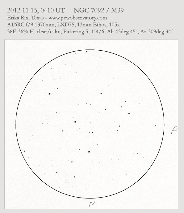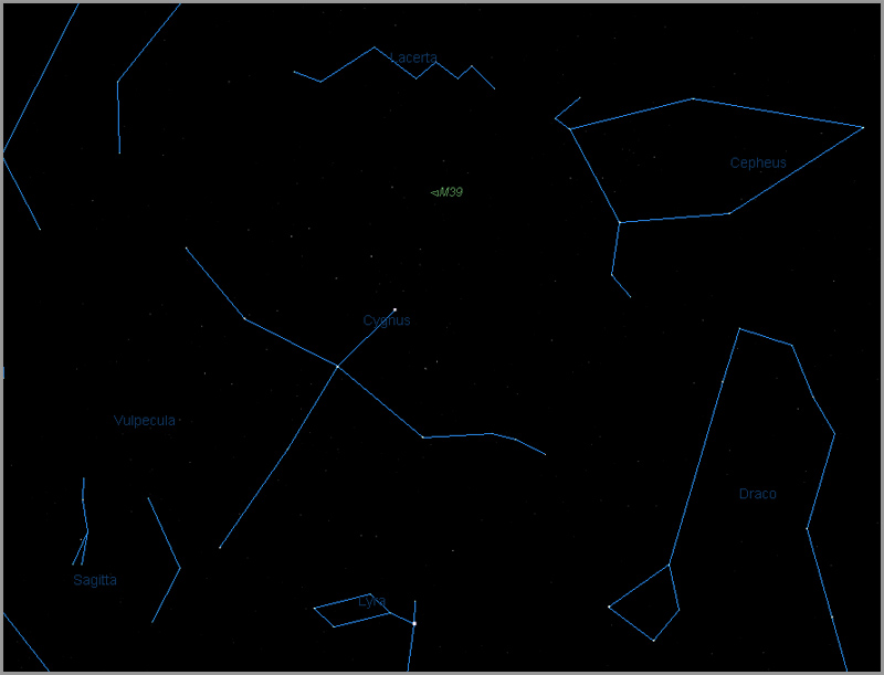 M39 is an easy-to-spot open cluster in Cygnus, ~9 degrees NE of Deneb. Three stars of 6.81, 6.56 and another 6.81 magnitude, make a chain NNW to SSE with 7.62 – 8.78 magnitude stars forming a chain NNE to SSW. There are several pairings of stars within this 30+ star grouping.