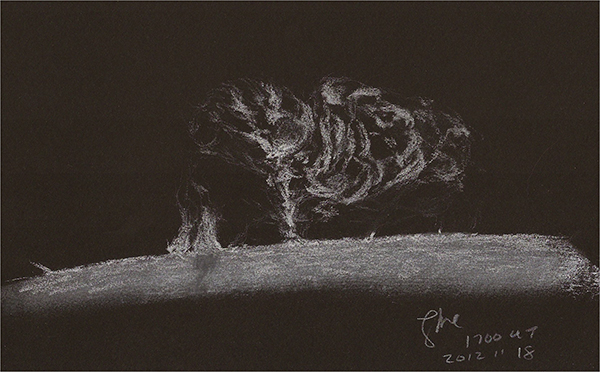 There were nine active regions scattered across the disk that day: ARs 1610-1616, 1618 and 1619. For some reason, I didn’t pull out my white light rig for a comparison and didn’t record good notes that day as a refresher. I do recall the very large prominence on display that day. It’s located at the 12 o’clock position on the image above. Shortly after taking the photo images of the Sun with my Canon, I grabbed a quick sketch of that prominence. Later that day, the prominence’s magnetic field lost its integrity and the prominence broke free and drifted off the limb. I had to work quickly because we know how fast prominences change. Generally my prominence sketches take me 5-10 minutes, or thereabouts, to sketch. That’s easier done when the prominence is small. This beast was so large and intricate that my sketch lacks finesse.