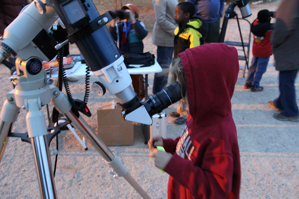 IMG_5537Outreach events are always a fun time, especially when they involve youngsters. It turned out to be a cloudy night for the Family Star Night event at the Barton Hills Elementary school. There were plenty of indoor activities for the guests to enjoy such as the Austin Mobile Planetarium, a display by the International Dark Sky Association and astronomical talks. The weather didn’t prevent a couple of us from setting up our telescopes outside for everyone to enjoy, however. The president of the Austin Astronomical Society, Joyce Lynch and her husband, Jim, showed up with a telescope and I brought a 102mm refractor along with a couple of binoculars and an assortment of other visual aids such as books, a planisphere, Rükl Atlas, and sketches. Our contact for this outreach event, Becky, was terrific and made us feel very welcomed. I was certainly thankful for the warm cup of hot chocolate and munchies she provided as well as her hospitality.102mmIMG_5534