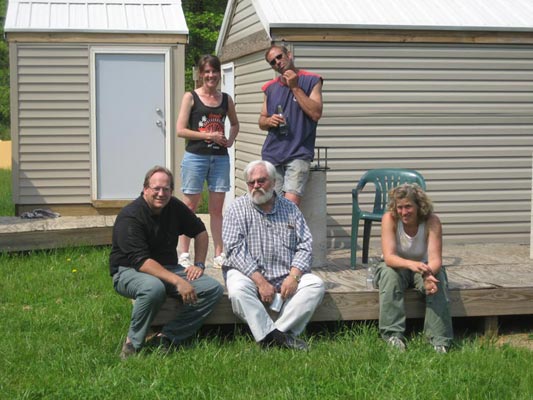 I hated to see the guys leave, but I knew we’d get to see at least Scott and Diane the next day at their house as my services were needed in the gardens at Backyard Observatories! Here’s a photo of the gang (minus Kenny) the next day at the Horstman’s house. Gotta love the observatory cluster there! And Lord knows I love the cluster of observers located around the cluster. That’s Gary Gibbs, John Crilly, Diane and Scott Horstman and me. There’s a really nice Sirius dome to the left just out of the view.