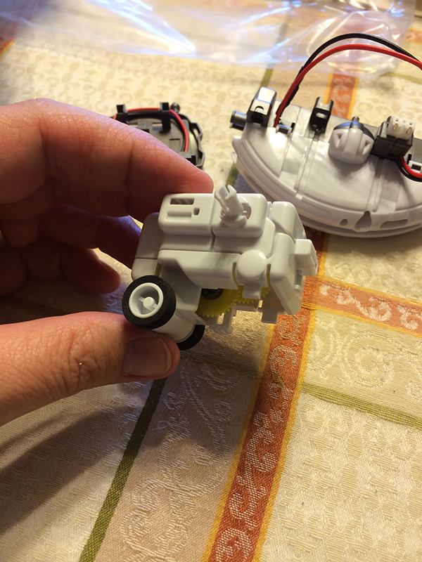 The individual robots share parts, so each will need to be disassembled before building another module. A few examples are shown below. The robots’ actions vary with each module: spinning, turning, walking, or rolling forward.