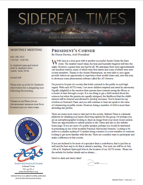 •July 2, 2013 • Leave a CommentThe July 2013 issue of Sidereal Times for the Austin Astronomical Society is now available for download.