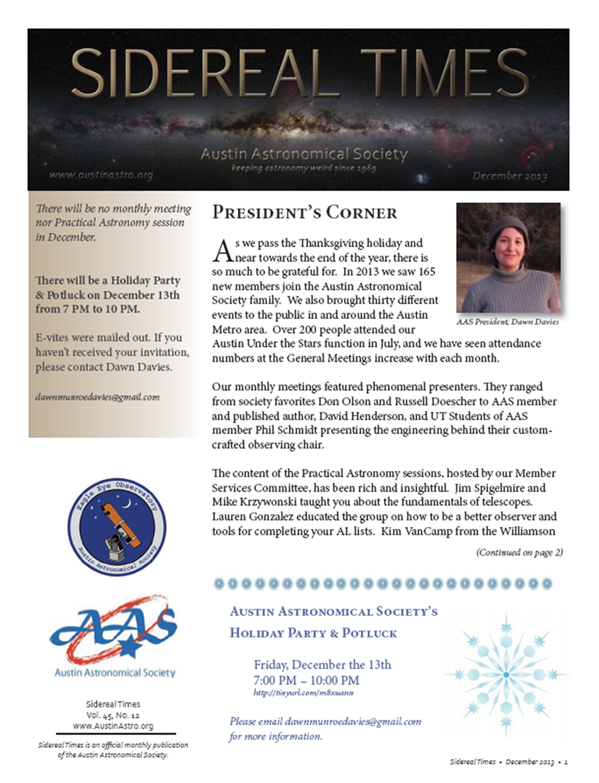 •December 5, 2013 • Leave a CommentThe December 2013 issue of Sidereal Times for the Austin Astronomical Society is now available for download.